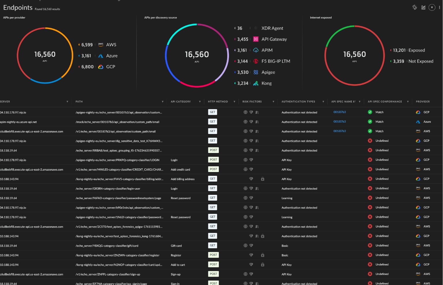 Obtenga una visibilidad completa de todo su panorama de API para eliminar los puntos ciegos. Descubra y valide automáticamente las API en puertas de enlace, cargas de trabajo y entornos de nube. Descubra las API ocultas, zombis y no gestionadas para obtener una visibilidad y un control completos.